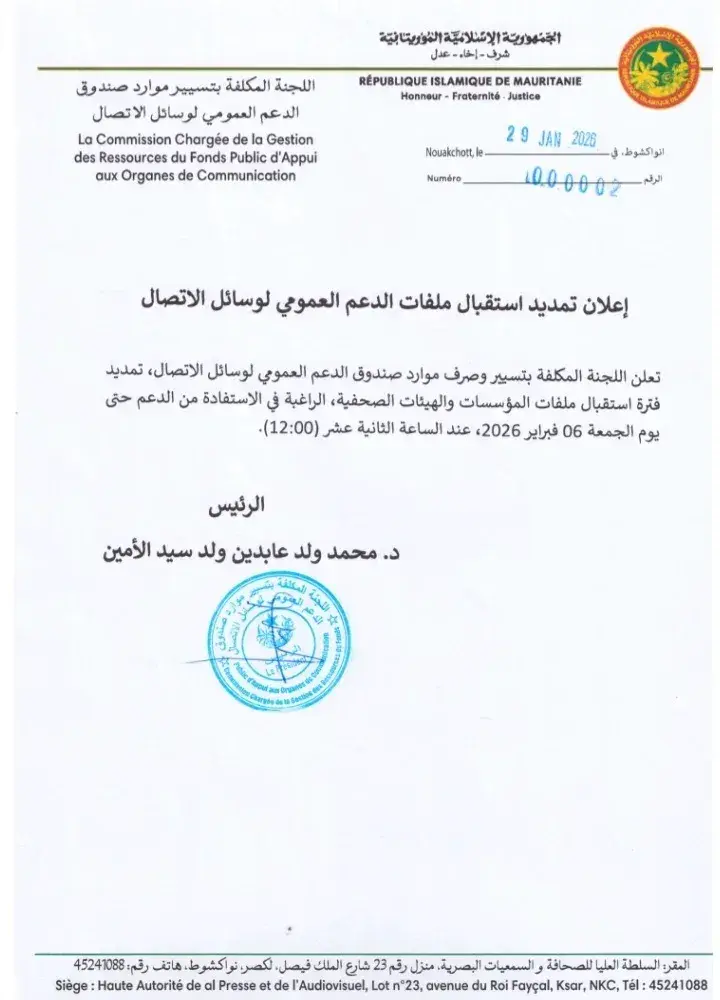 تعلن اللجنة المكلفة بتسيير وصرف موارد صندوق الدعم العمومي لوسائل الاتصال، تمديد فترة استقبال ملفات المؤسسات والهيئات الصحفية، الراغبة في الاستفادة من الدعم حتى يوم الجمعة 06 فبراير 2026، عند الساعة الثانية عشر (12:00)