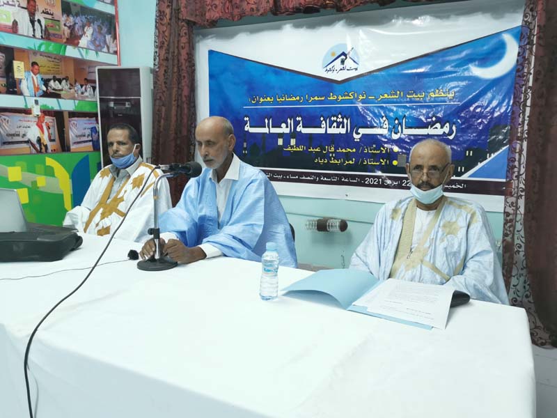 نظم "بيت الشعر - نواكشوط" ليلة البارحة بقاعة الأنشطة في البيت، سمرا رمضانيًا تحت عنوان: "رمضان في الثقافة العالمة"، وذلك بحضور كوكبة من الشعراء والمثقفين، حيث استمع الحضور إلى محاضرتين ألقاهما كل من: الأستاذ محمد فال عبد اللطيف، والأستاذ لمرابط دياه.