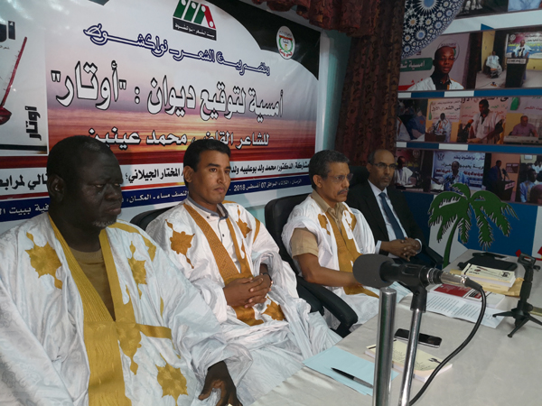 وقع الشاعر الموريتاني القاضي ولد محمد عينينَ ديوانه الجديد "أوتار"، مساء اليوم الثلاثاء، بمقر بيت الشعر - نواكشوط، على هامش أمسية علمية حاشدة تناولت أدب الشاعر ولد عينين، وأعماله الشعرية الصادرة مؤخرا، خاصة "أرماس السراب" و"أوجاع الطين" و"أوتار".