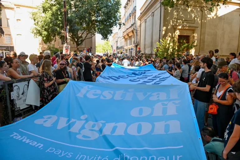 ممثلون وموسيقيون يشاركون في العرض المسرحي لمهرجان أفينيون الفرنسي 2024 (الفرنسية)