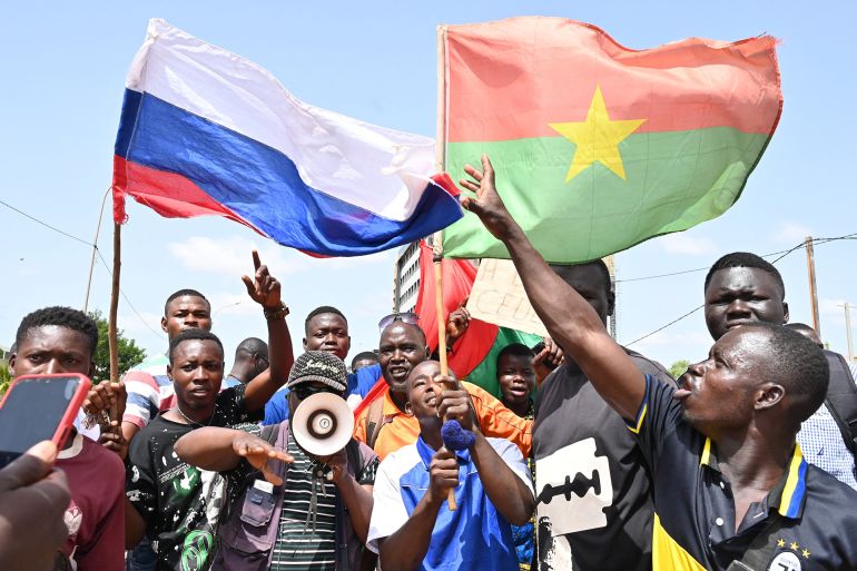مجموعة من مواطني بوركينا فاسو تلوح بعلمي بلادها وروسيا أمام مبنى اجتمع فيه ممثلو المجموعة الاقتصادية لدول غرب أفريقيا (إكواس) في واغادوغو بالرابع من أكتوبر/تشرين الأول الجاري (الفرنسية)