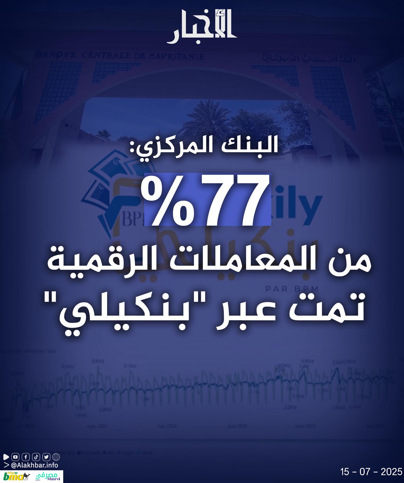 الأخبار (نواكشوط) – كشف البنك المركزي الموريتاني في تقرير صادر عنه أن نسبة 77% من المعاملات الرقمية خلال الفترة من 12 يونيو 2024 إلى 16 مايو 2025 تمت عبر تطبيق "بنكيلي".