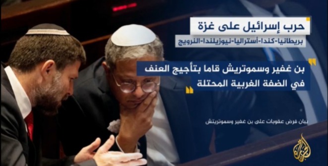 أعلنت بريطانيا وكندا وأستراليا ونيوزيلندا والنرويج فرض عقوبات على وزير الأمن القومي الإسرائيلي إيتمار بن غفير وزير المالية بتسلئيل سموتريتش. وتنص العقوبات على حظر السفر وتجميد الأصول.