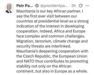 وصف الرئيس التشيكي بيتر بافيل موريتانيا بأنها تعد شريكًا أساسيًا لبلاده في إفريقيا.