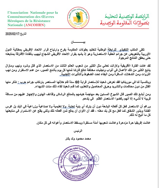 الأخبار (نواكشوط) أشادت "الرابطة الوطنية لتخليد بطولات المقاومة" بقرار الاتحاد الإفريقي المتعلق بمطالبة الدول الأوربية بالتعويض عن جرائم الحقبة الاستعمارية.