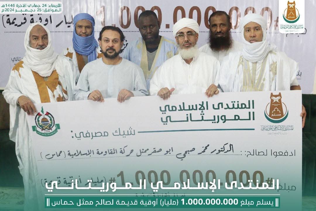 الأخبار (نواكشوط) – سلم المنتدى الإسلامي الموريتاني أمس الأربعاء شيكا بمبلغ مليار أوقية قديمة لممثل حركة المقاومة الإسلامية حماس في موريتانيا الدكتور محمد صبحي أبو صقر، وذلك في نشاط أقيم بمقر المنتدى في نواكشوط.