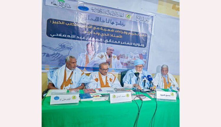 خصص اتحاد الأدباء والكتاب الموريتانيين، ندوته الأسبوعية “شاي الأربعاء” مساء اليوم، في مقره في نواكشوط، لتكريم الشاعر أدي ولد آدبه، ومؤازرة ممثل موريتانيا في مسابقة أمير الشعراء الشاعر المختار ولد عبد الله.