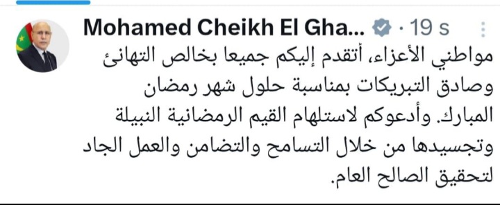 هنأ فخامة رئيس الحمهورية، السيد محمد ولد الشيخ الغزواني، كافة المواطنين، بمناسبة حلول شهر رمضان المبارك.
