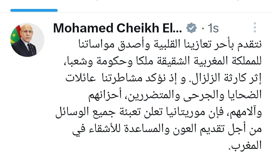 أعربت السفارة المغربية في العاصمة نواكشوط عن بالغ تقديرها وامتنانها للرئيس محمد ولد الشيخ الغزواني على برقية المواساة والتضامن التي بعثها للعاهل المغربي محمد السادس، بعد الزلزال الذي ضرب عدة مدن من البلاد، ليل الجمعة/ السبت.