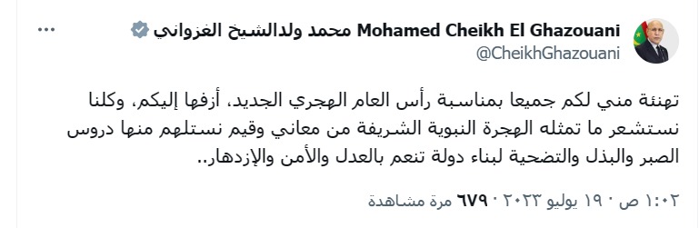 وقال ولد الغزواني في تغريدة على حسابه في تويتر إنه يجب استشعار ما تمثله الهجرة النبوية الشريفة من معاني وقيم.