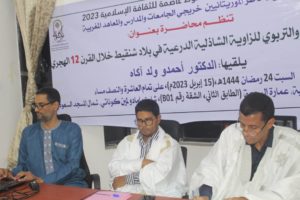 نظمت جمعية الأطر الموريتانيين خريجي الجامعات والمدارس والمعاهد المغربية، ليلة الأحد محاضرة بعنوان: "التأثير العلمي والتربوي للزاوية الشاذلية الدرعية في بلاد شنقيط خلال القرن 12 الهجري"، ألقاها الدكتور أحمدو ولد آكاه، عضو المجلس العلمي لجمعية الأطر.