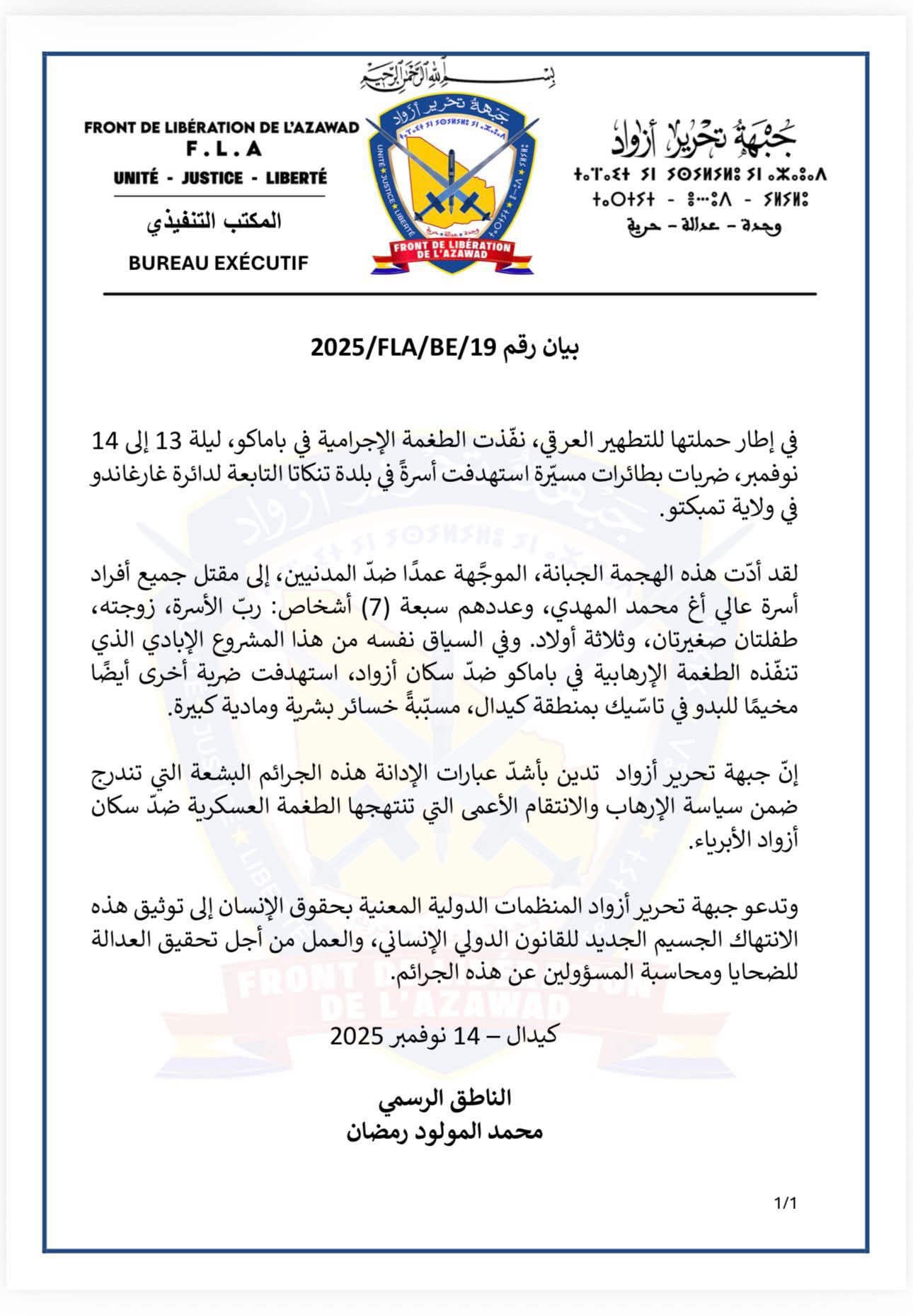 الأخبار (باماكو) - اتهمت جبهة تحرير أزواد الجيش المالي بمقتل جميع أفراد أسرة مكونة من 7 أشخاص، إثر ضربة بطائرات مسيرة، استهدفت منزل الأسرة الواقع في بلدة (تنكاتا) التابعة لدائرة (غارغاندو) بولاية تمبكتو.