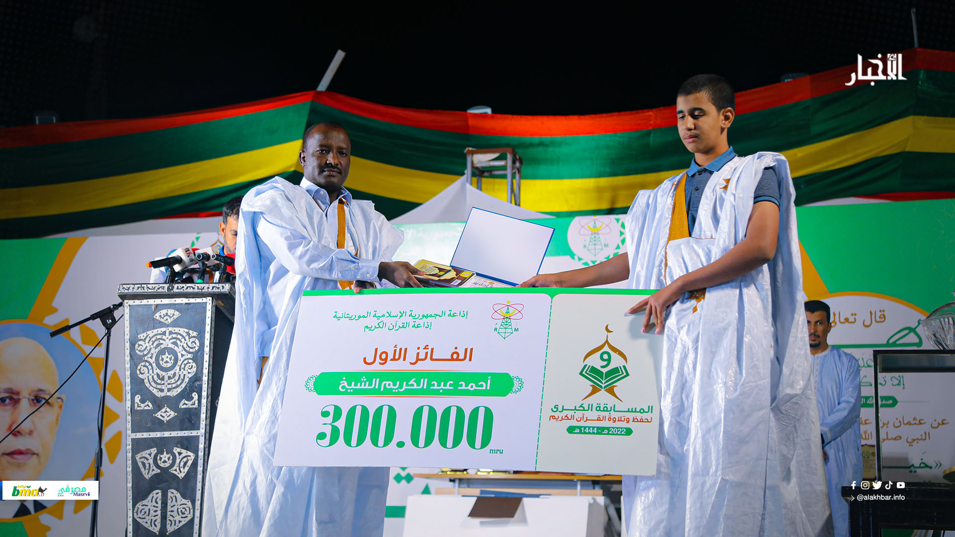 الأخبار (نواكشوط) – وزعت إذاعة موريتانيا ليلة البارحة جوائز "المسابقة الكبرى" للقرآن الكريم، حيث كرمت 63 حافظا، وذلك بحضور وزري الثقافة والشباب والرياضة، والشؤون الإسلامية والتعليم الأصلي.