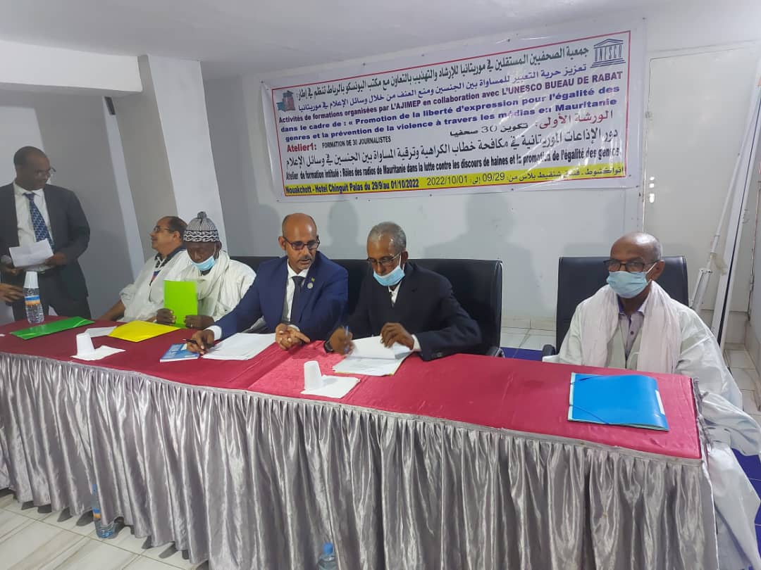نظمت جمعية الصحفيين المستقلين في موريتانيا للإرشاد والتهذيب بالتعاون مع مكتب اليونسكو بالرباط دورة تكوينية لصالح ثلاثين صحفيا تعزيزا لحرية التعبير والمساواة بين الجنسين ومنع العنف من خلال وسائل الإعلام في موريتانيا وتتناول الورشة التي تدوم أشغالها ثلاثة أيام دور الإذاعات الموريتانية في مكافحة خطاب الكراهية وترقية المساواة بين الجنسين في وسائل الإعلام