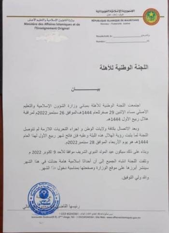 أعلنت اللجنة الموريتانية للأهلة مساء اليوم أن بعد غد الأربعاء الموافق 28 سبتمبر هو فاتح شهر ربيع الأول من العام الهجري 1444.