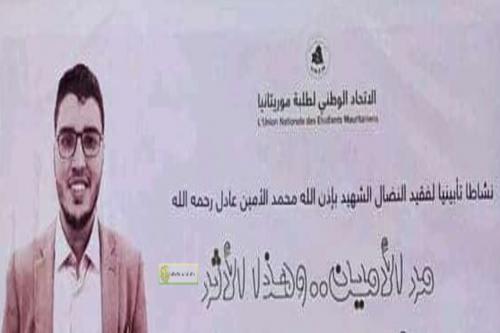 نظم الاتحاد الوطني لطلبة موريتانيا مساء اليوم السبت بقاعة المحاضرات بالمعهد الجامعي المهني في نواكشوط، أمسية تأبينية للمناضل في صفوفه الإعلامي الشاب محمد الأمين عادل رحمه الله.