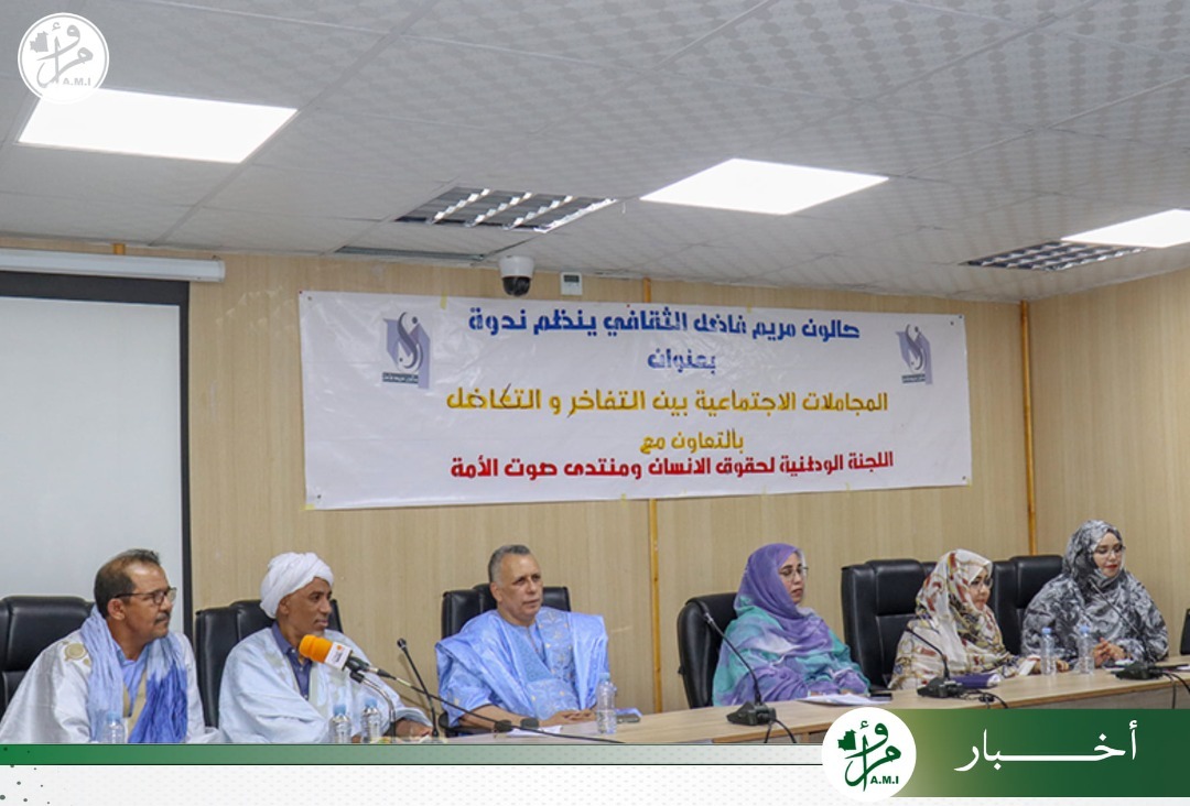 نظم صالون مريم فاضل الثقافي، بالتعاون مع اللجنة الوطنية لحقوق الإنسان ومنتدى صوت الأمة، مساء أمس الأحد بمقر جهة نواكشوط بولاية نواكشوط الغربية، ندوة تحت عنوان: "المجاملات الاجتماعية بين التفاخر والتكافل".