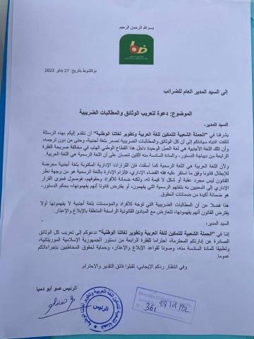 وجهت الحملة الشعبية للتمكين للغة العربية وتطوير لغاتنا الوطنية، اليوم رسالتين للاتحادية الموريتانية لكرة القدم والإدارة العامة للضرائب، حول تعريب الوثائق، ومخاطبة الجنهور باللغة الرسمية أو إحدى اللغات الوطنية.