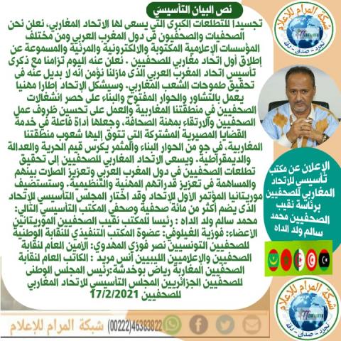 المجلس التأسيسي أصدر بيانا قال فيه إن التشكيل أتى تزامنا مع ذكرى تأسيس اتحاد المغرب العربي بهدف العمل على حصر انشغالات الصحفيين في المنطقة المغاربية والعمل على تحسين ظروف عمل الصحفيين والارتقاء بمهنة الصحافة.