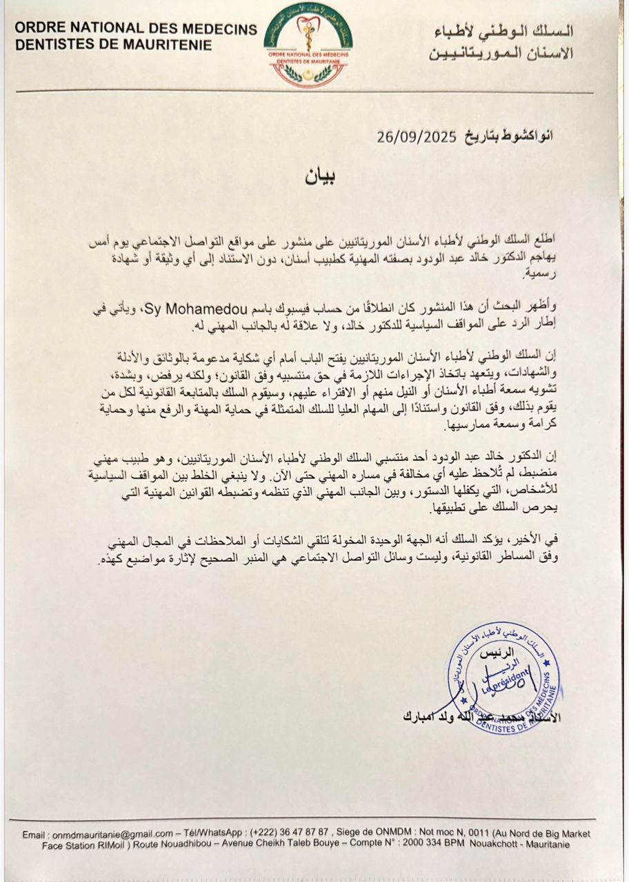الأخبار (نواكشوط) - دان السلك الوطني لأطباء الأسنان الموريتانيين ما وصفه بحملة تشويه استهدفت الدكتور خالد عبد الودود على منصات التواصل الاجتماعي، مؤكدًا أن الهجوم الذي تعرّض له لا يستند إلى أي وثيقة أو دليل مهني، بل جاء كرد فعل على مواقفه السياسية.