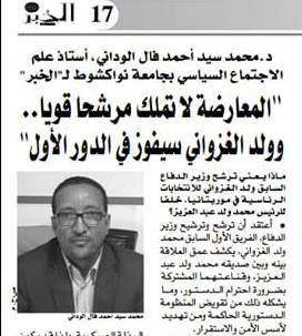 قال أستاذ علم الإجتماع السياسى بجامعة نواكشوط ومنسق تحالف الأمل فى الحوضين محمد ولد سيد أحمد فال(بياتى ) إن ترشح وترشيح وزير الدفاع الفريق الاول السابق محمد ولد الغزوانى يكشف عمق العلاقة بينه وبين صديقه محمد ولد عبد العزيز وقناعتهما المشتركة بضرورة احترام الدستور، وما يشكله تقويض المنظومة الدستورية الحاكمة من تهديد لأسس الأمن والاستقرار".