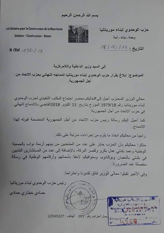 أعلن حزب الوحدوي لبناء موريتانيا اندماجه النهائي بحزب الاتحاد من أجل الجمهورية، وقال الحزب في رسالة بعث بها إلى وزير الداخلية واللامركزية إن القرار جاء خلال اجتماع للمكتب التنفيذي للحزب، عقده في 13 اكتوبر الجاري.