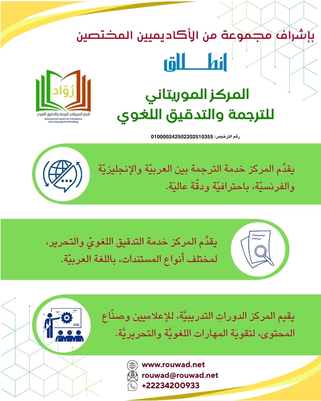 أُعلن حديثاً عن تأسيس (المركز الموريتاني للترجمة والتدقيق اللغوي)، وهو مؤسسة أكاديمية جديدة يشرف عليها مختصون في اللغة والترجمة، من الشباب الموريتانيين ذوي الخبرة الإعلامية واللغوية.