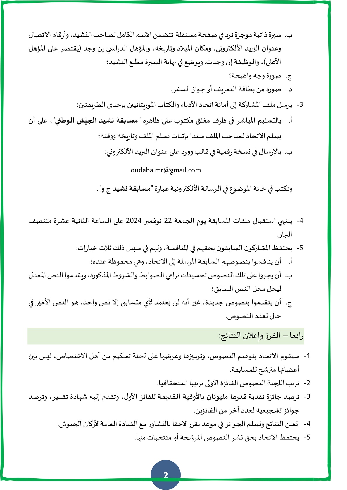 بالإشارة إلى المسابقة التي أعلن عنها اتحاد الأدباء والكتاب الموريتانيين من أجل تأليف كلمات نشيد الجيش الوطني، وبناء على ما ورد من ملاحظات وتوصيات في محضر لجنة الفرز والتحكيم، وبطلب من الجهة المختصة في الأركان العامة، بعد اطلاعها على ملاحظات وتوصيات لجنة الفرز، فقد تبينت الحاجة إلى إعادة فتح باب المشاركة في المسابقة وتمديد أجلها، والتذكير بمزيد من التفصيل بشروطها وضوابط المشاركة فيها، أملا في بذل الوسع من أجل الحصول على أفضل نشيد ممكن، يليق بجيشنا الوطني وببلاد المليون شاعر. وهكذا تقررت إعادة فتح باب المشاركة في المسابقة وتمديد أجلها وفق الشروط والضوابط الآتي ذكرها: