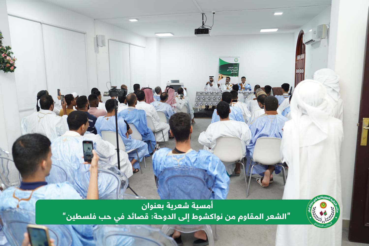 نظم مكتب الجالية الموريتانية في دولة قطر أمسية شعرية بعنوان “الشعر المقاوم من نواكشوط إلى الدوحة: قصائد في حب فلسطين” أنعشها شعراء من قطر وموريتانيا، وحضرها لفيف من جمهور الشعر والأدب، إضافة إلى رئيس مكتب الجالية السيد عبد الفتاح ولد مختيري والأمين العام سيد أحمد الطالب سيدي وأعضاء هيئات مكتب الجالية الموريتانية بقطر.