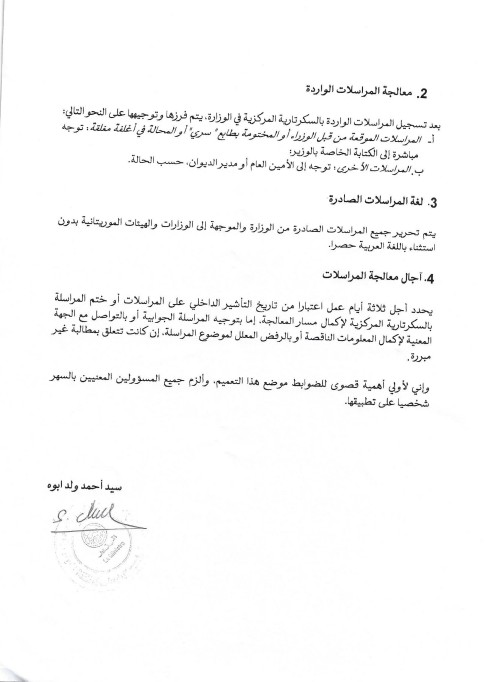 وأشار التعميم إلى أن إعداد المذكرات الشفوية وإحالة المراسلات الموجهة إلى جهات خارجية اختصاص حصري لوزارة الخارجية، مضيفا أنه يجب التوقف عن توجيه المذكرات والمراسلات المتعلقة بمواضيع التنمية إلى السفارات الأجنبية في نواكشوط والاكتفاء بتوجيه رسائل إدارية بشأنها إلى وزارة الخارجية تطلب منها إحالة تلك المراسلات بمذكرات شفوية إلى السفارات الأجنبية.