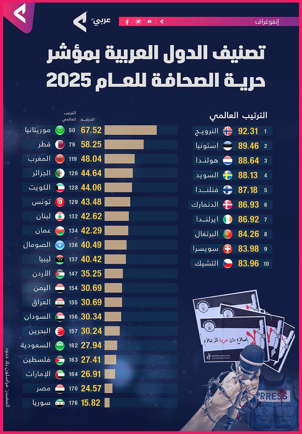 وفيما يلي إنفوغراف بتصنيف الدول على مؤشر حرية الصحافة للعام 2025: