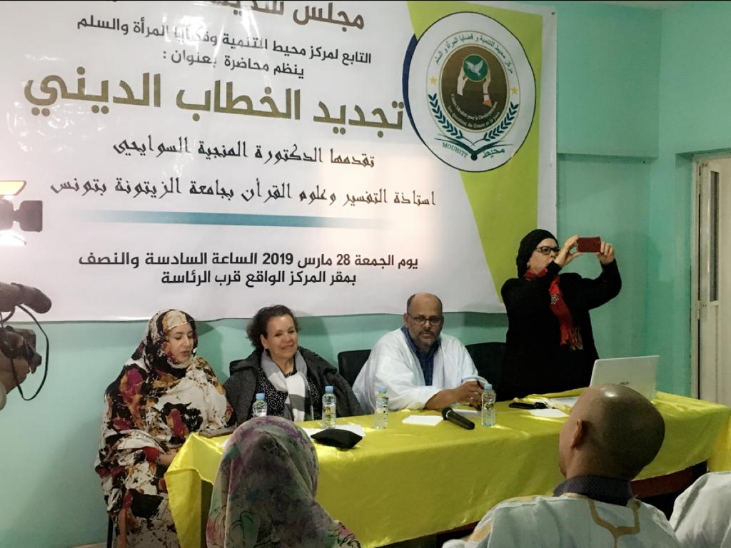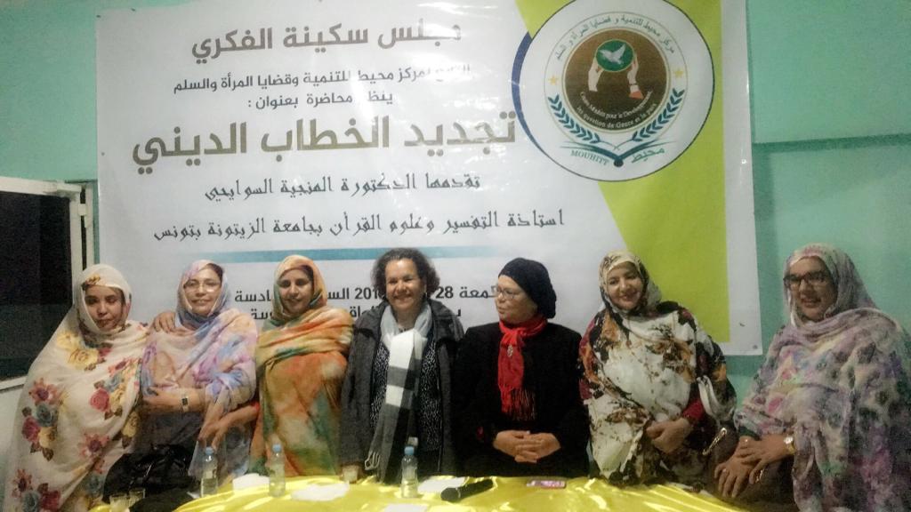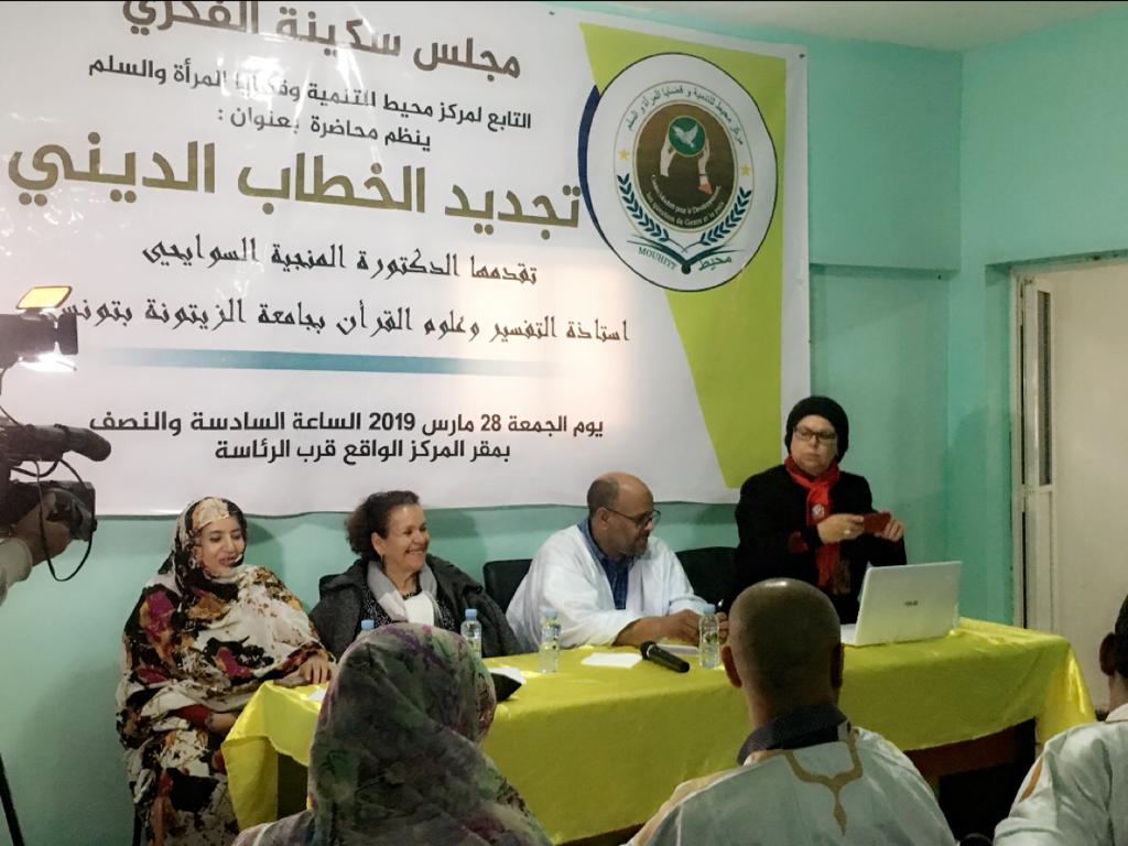 نظم مركز محيط للتنمية وقضايا المرأة والسلم الذي ترأسه الوزيرة السابقة مكفولة بنت آكاط مساء أمس بمقره المركزي في نواكشوط محاضرة فكرية تحت عنوان "تجديد الخطاب الديني" قدمتها أستاذة التفسير وعلوم القرآن بجامعة الزيتونة المنجية السوايحي.
