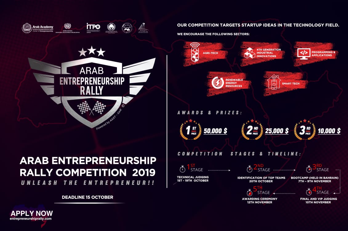 تنظم الأكاديمية العربية للعلوم والتكنولوجيا والنقل البحري مسابقة" رالي العرب لريادة الأعمال، وذلك بالتعاون مع مركز ريادة الأعمال التابع لمنظمة الأمم المتحدة للتنمية الصناعية "اليونيدو" بالبحرين، و غرفة التجارة و الصناعة بالبحرين، و اتحاد الغرف العربية، وعدد من المؤسسات الداعمة لريادة الأعمال وبمشاركة عدد كبير من الجامعات العربية.