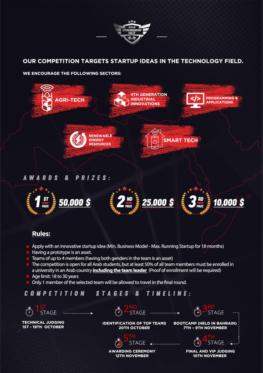 وأضاف عبدالغفار أن هذه المسابقة مخصصة لطلاب الجامعات العربية بهدف تمكين الموهوبين وأصحاب الأفكار المبتكرة من المنافسة إقليميًا والفوز بجوائز المسابقة المقدمة من غرفة التجارة و الصناعة بالبحرين و التي تزيد على مليون جنيه مصري.حيث تبلغ الجائزة الأولي ٥٠ ألف دولار ، والجائزة الثانية قيمتها ٢٥ ألف دولار والثالثة قيمتها ١٠ آلاف دولار.