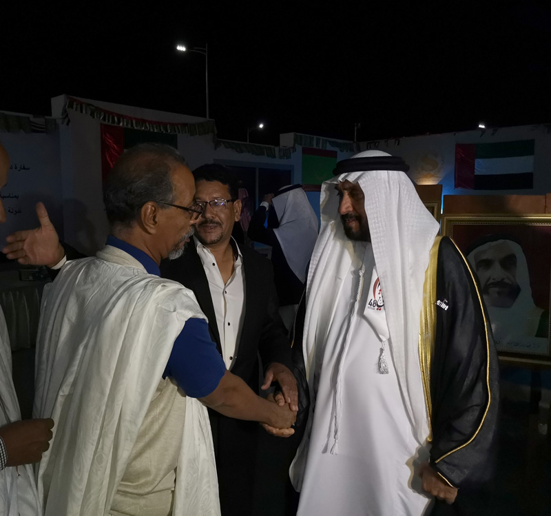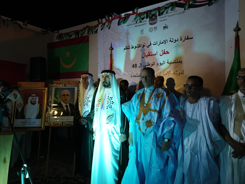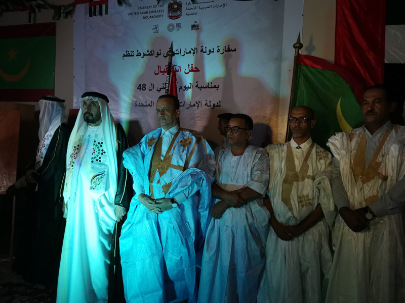 احتفلت النخبة السياسية والثقافية الموريتانية هذه الليلة بالذكرى الثامنة والأربعين لتأسيس دولة الإمارات العربية المتحدة وذلك خلال حفل عشاء فاخر، بفندق "سون ست هوتيل" بنواكشوط، أقامه بهذه المناسبة سعادة حمد غانم حمد المهيري سفير دولة الإمارات العربية المتحدة المعتمد لدى موريتانيا، وهو الحفل الذي شهد حضورا نوعيا تقدمه وفد رسمي برئاسة وزير الشؤون الخارجية والتعاون والموريتانيين في الخارج إسماعيل ولد الشيخ أحمد.