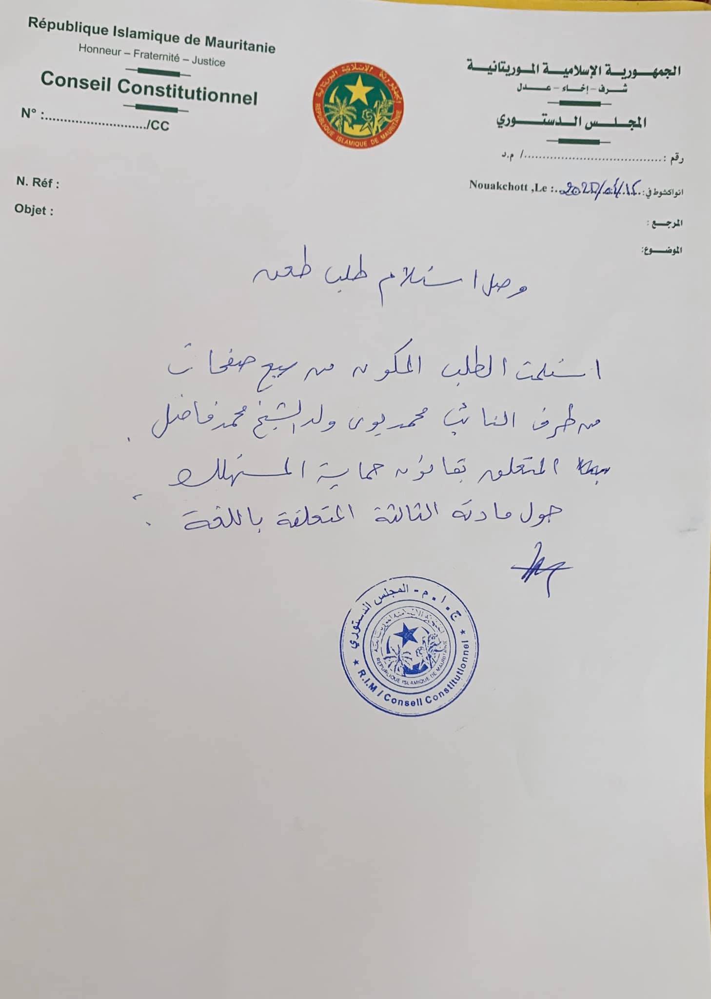 أولًا : أتقدم بالشكر الجزيل إلى 53 نائبًا من مشارب سياسية شتى ، جمعهم على التوقيع على هذا الطلب هدف وحيد ، هو حماية الدستور الموريتاني .