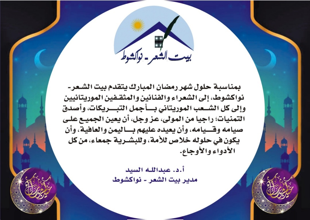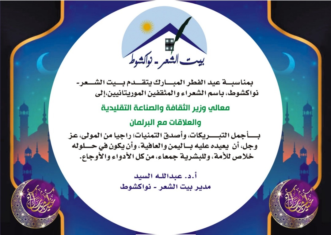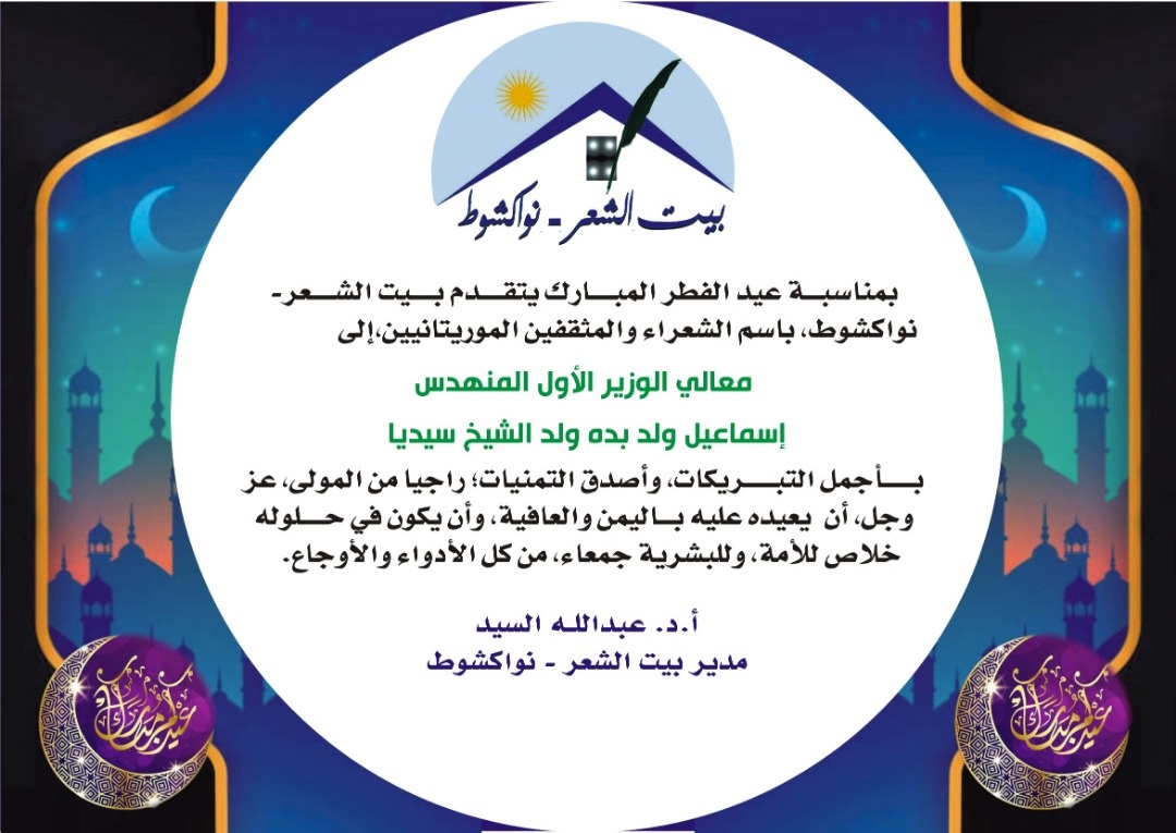 قدم الأستاذ الدكتور عبد الله السيد مدير بيت الشعر في نواكشوط تهانئه باسم الشعراء والمثقفين الموريتانيين إلى فخافة رئيس الجمهورية محمد ولد الشيخ الغزواني وذلك بمناسبة عيد الفطر المبارك.