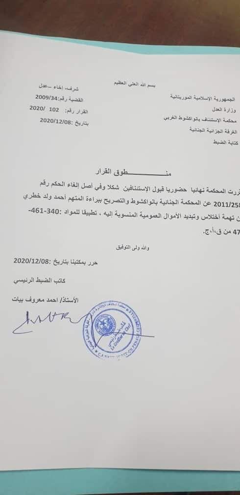 والآن وقد انجلى الغبار عن الحقيقة، واستبان الحق واتضح الأمر، أغتنم الفرصة التي أتاحها حكم البراءة لأشكر جزيل الشكر فخامة رئيس الجمهورية السيد محمد ولد الشيخ الغزواني الذي رسخ قواعد ثابته لعدالة مستقلة، كما لا أنسى جميع الذين آمنوا دائما ببراءتي ودافعوا عن ذلك، ومنهم الحشود التي تظاهرت في جميع ولايات الوطن لدعمي والتنديد باعتقالي التعسفي آنذاك الذي كنت ضحيته لسنوات.