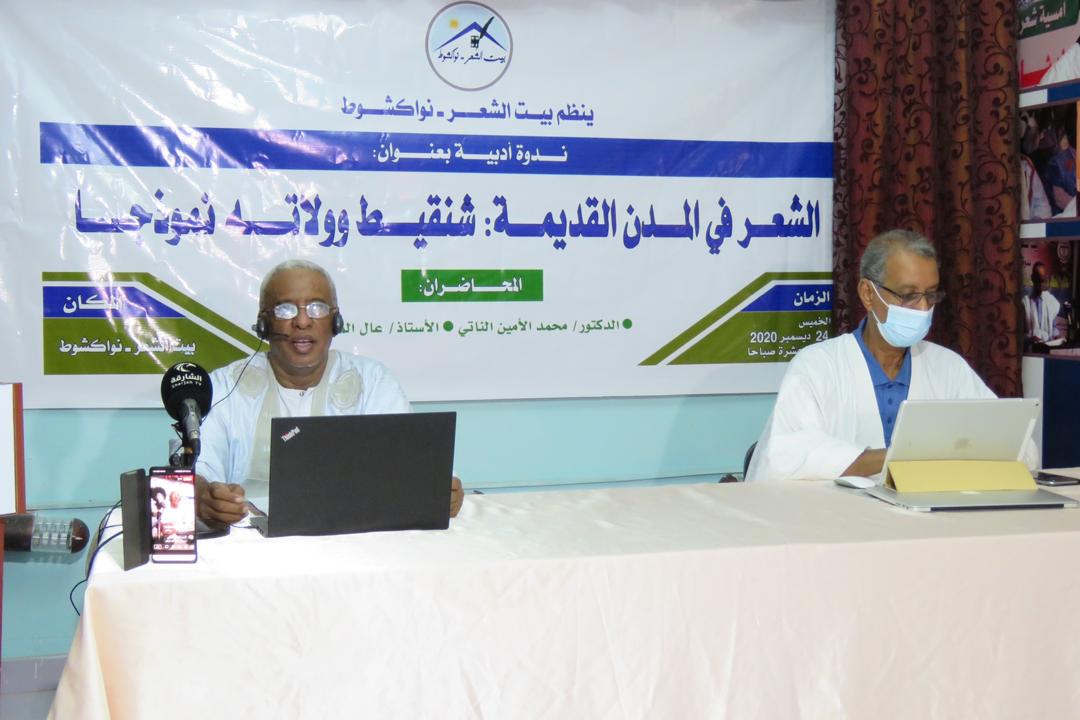 نظم "بيت الشعر - نواكشوط" ظهر اليوم (الخميس) ندوة أدبية بعنوان "الشعر في المدن القديمة: شنقيط وولاته نموذجا"، حاضر فيها اثنان من أبرز الأساتذة الموريتانيين وهما: الأستاذ عال المرواني المدير العام للمؤسسة الموريتانية لحماية المدن القديمة سابقا، ومحافظ المتحف الوطني سابقا، والشاعر الدكتور محمد الأمين الناتي، الوزير السابق، ورئيس قسم اللغة العربية بكلية الآداب والعلوم الإنسانية بجامعة نواكشوط العصرية.