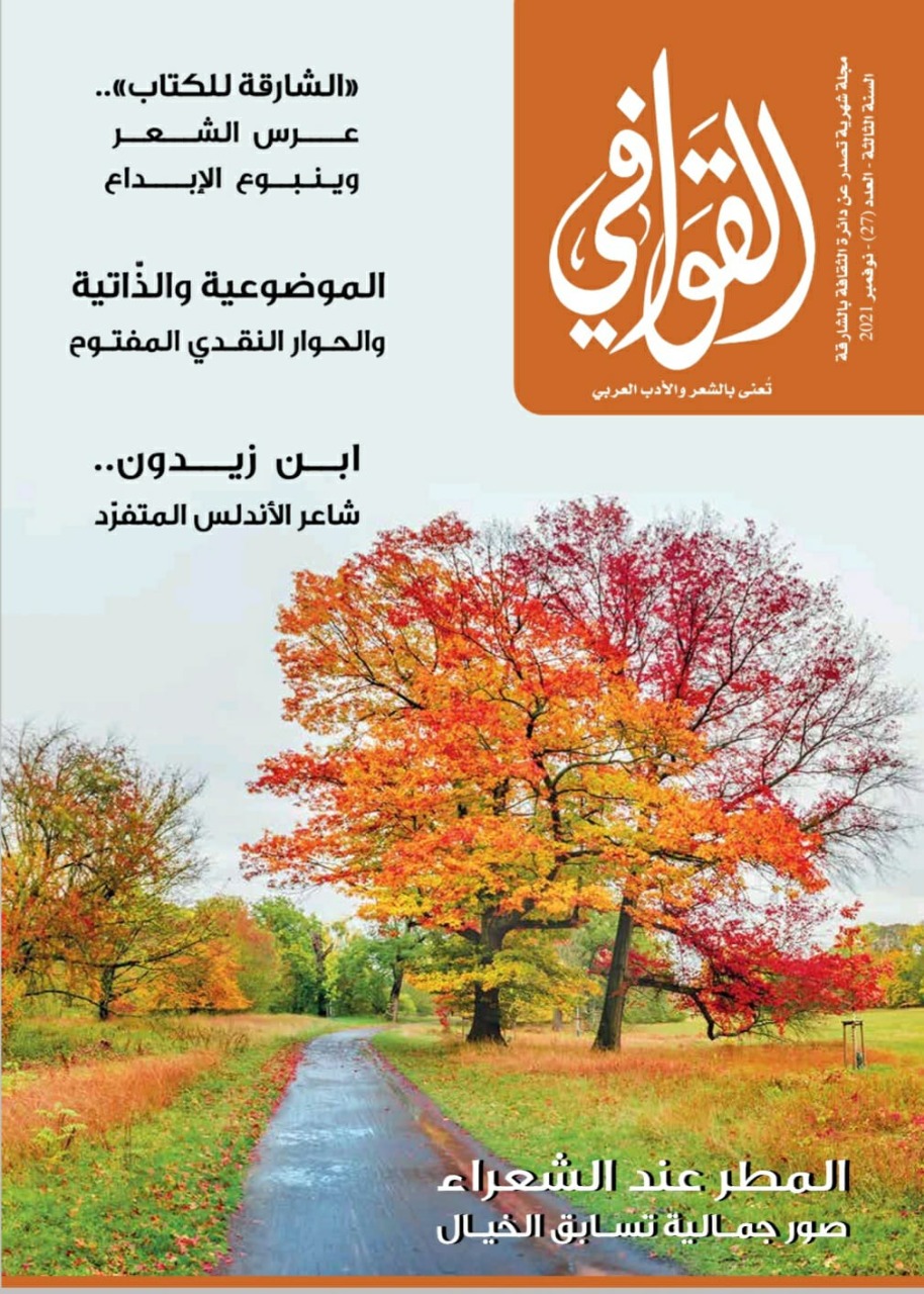 صدر عن بيت الشعر في دائرة الثقافة بالشارقة العدد 27 من مجلة "القوافي" الشهرية؛ وجاءت افتتاحية المجلة تحت عنوان " عصور الشعر الزاهرة.. دهشة لا تنطفئ"، وفيها: تتّكئ القصيدة في سياقها على الذاتيّة والموضوعيّة، فالذات هي النبع الذي يتدفق منه البوح، لتعبر المسافات في رحلتها إلى أعماق الشعرية الأصيلة، وهي في هذه الرحلة تسعى إلى أن تكون لها رسالة وهدفاً، فهذا التواصل والترابط بينهما يجعل للوصول قيمة ويكسبه دهشة وبهاء، على أن الذات في أحيان أخرى لا تلتفت إلى الموضوعيّة، فتعبّر عن جمالياتها الخاصة دون الالتفات إلى همومٍ خارج إطارها، فتشكّل انطلاقة واسعة نحو العالم.. فهل ينبغي التفرقة بين ما هو موضوعي وذاتي؟ حيث إن هذين الجانبين لم يحظيا بالاهتمام الكافي في الأدب العربي، إلّا في القرن العشرين.