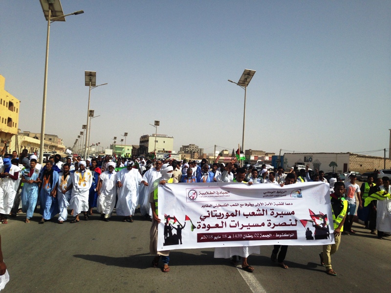 نظم الرباط الوطني لنصرة الشعب الفلسطيني والمبادة الطلابية لمناهضة الاختراق الصهيوني وللدفاع عن القضايا العادلة مسيرة اليوم بنواكشوط دعما لمسيرات العودة في فلسطين، واختتمت بمهرجان خطابي أمام السفارة الأمريكية في نواكشوط.