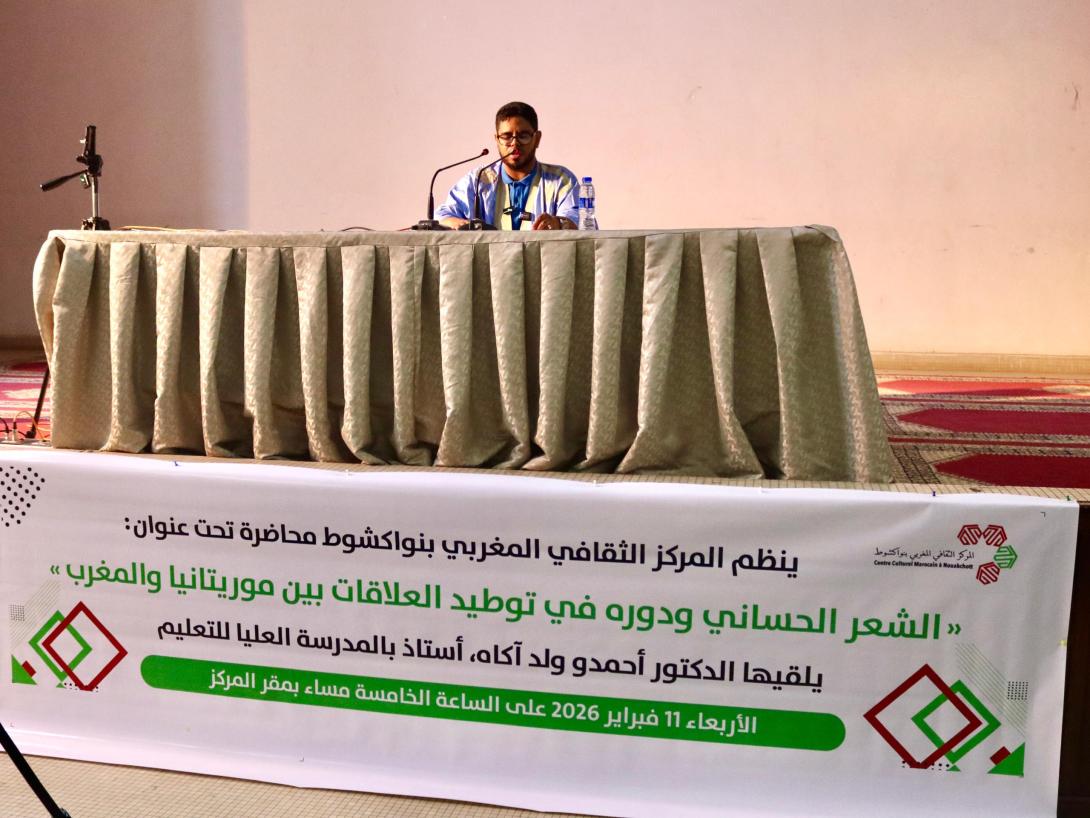 ألقى الدكتور أحمدو ولد آكّـاهْ، مساء اليوم الأربعاء، بالمركز الثقافي المغربي، محاضرة تحت عنوان: "الشعر الحساني ودوره في توطيد العلاقات بين موريتانيا والمغرب".