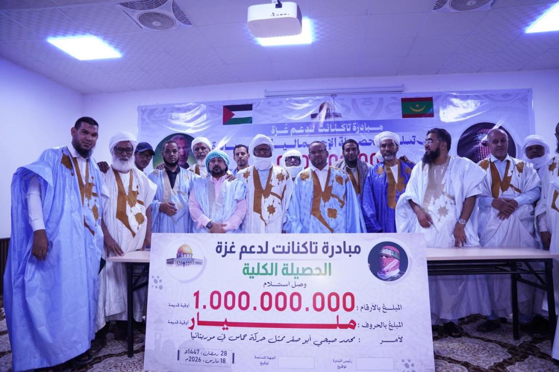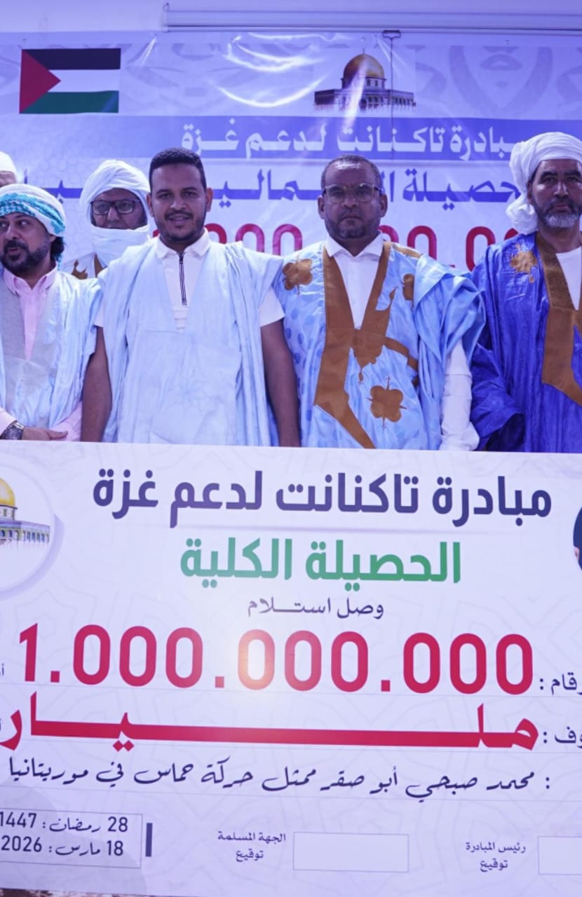 قدمت قبيلة "تاكنانت"، ليلة أمس بالمركز الثقافي بلكصر بالعاصمة نواكشوط، حصيلة تبرعها لصالح سكان غزة والذي وصل إلى مليار أوقية قديمة.