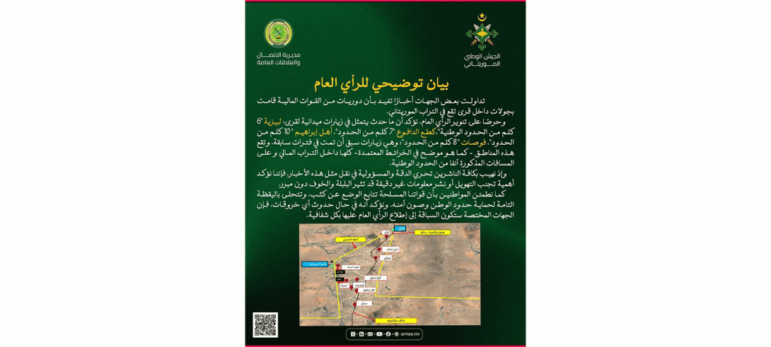وحرصا على تنوير الرأي العام، نؤكد أن ما حدث يتمثل في زيارات ميدانية لقرى لبيزية (6 كيلومتر من الحدود الوطنية)، كطع الدافوع (7 كيلومتر من الحدود)، أهل إبراهيم (10 كيلومتر من الحدود)، فوصات (8 كيلومتر من الحدود)؛ وهي زيارات سبق أن تمت في فترات سابقة، وتقع هذه المناطق – كما هو موضح في الخرائط المعتمدة – كلها داخل التراب المالي وعلى المسافات المذكورة آنفا من الحدود الوطنية.